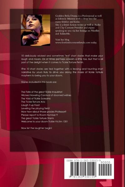 10 wicked and deliciously "evil" Tickle Torture Fetish Stories tied together with a taunting and devious narration, to bring you to your tickle doom. Female Tickle Mavens visit their wicked laughter and insanity inducing torments on male and female victims, who'll end up as decorations in Goddess Bella Donna's Maze. With each of these fetish stories that you witness as a helpless bystander you are coming closer to the dungeon in the middle of the Maze, where you'll end up as Tickle Victim number 1001. Dare you enter the Maze? Just remember once you enter you'll never leave again.