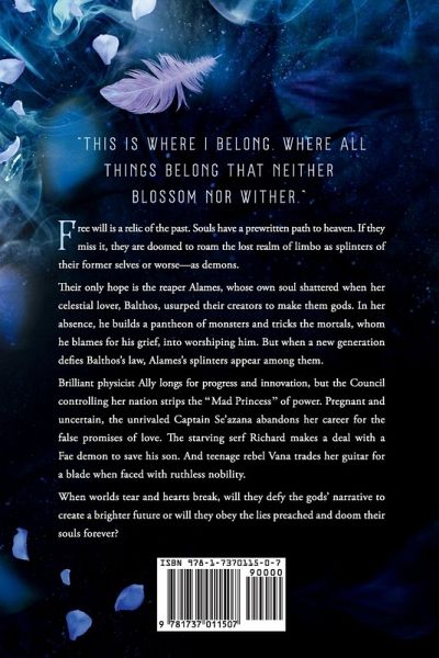 Free will is a relic of the past. Souls have a prewritten path to heaven. If they miss it, they are doomed to roam the lost realm of limbo as splinters of their former selves or worse-as demons. Their only hope is the reaper Alames, whose own soul shattered when her celestial lover, Balthos, usurped their creators to make them gods. In her absence, he builds a pantheon of monsters and tricks the mortals, whom he blames for his grief, into worshiping him. But when a new generation defies Balthos's law, Alames's splinters appear among them. Brilliant physicist Ally longs for progress and innovation, but the Council controlling her nation strips the "Mad Princess" of power. Pregnant and uncertain, the unrivaled Captain Se'azana abandons her career for the false promises of love. The starving serf Richard makes a deal with a Fae demon to save his son. And teenage rebel Vana trades her guitar for a blade when faced with ruthless nobility. When worlds tear and hearts break, will they defy the gods' narrative to create a brighter future or will they obey the lies preached and doom their souls forever? For fans of A GAME OF THRONES and THE PRIORY OF THE ORANGE TREE comes an immersive epic fantasy with a diverse cast of underdogs fighting demons, gods, and oppression. This story contains adult themes. For trigger warnings and representation details, please visit www.leafalls.com.