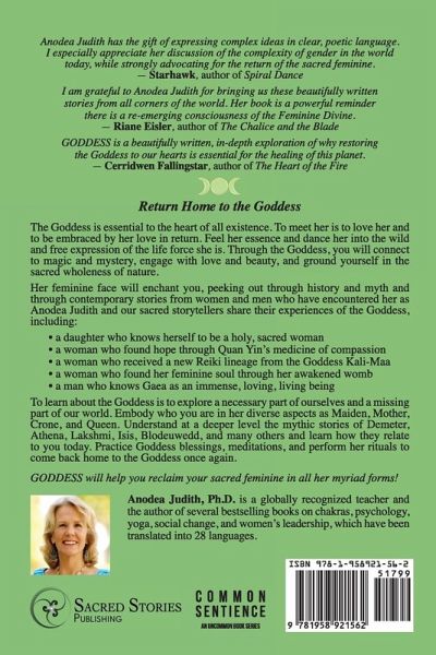 Return Home to the Goddess The Goddess is essential to the heart of all existence. To meet her is to love her and to be embraced by her love in return. Feel her essence and dance her into the wild and free expression of the life force she is. Through the Goddess, you will connect to magic and mystery, engage with love and beauty, and ground yourself in the sacred wholeness of nature. Her feminine face will enchant you, peeking out through history and myth and through contemporary stories from women and men who have encountered her as Anodea Judith and our sacred storytellers share their experiences of the Goddess, including: · a daughter who knows herself to be a holy, sacred woman · a woman who found hope through Quan Yin's medicine of compassion · a woman who received a new Reiki lineage from the Goddess Kali-Maa · a woman who found her feminine soul through her awakened womb · a man who knows Gaea as an immense, loving, living being To learn about the Goddess is to explore a necessary part of ourselves and a missing part of our world. Embody who you are in her diverse aspects as Maiden, Mother, Crone, and Queen. Understand at a deeper level the mythic stories of Demeter, Athena, Lakshmi, Isis, Blodeuwedd, and many others, and learn how they relate to you today. Practice Goddess blessings, meditations, and perform her rituals to come back home to the Goddess once again. GODDESS will help you reclaim your sacred feminine in all her myriad forms! GODDESS: Blessed Reunions with the Feminine Face of the Divine is part of Common Sentience, an uncommon book series that brings the mystical into the mainstream by sharing spiritual wisdom and true, personal stories of the Divine experiences many are having. Look for other books in this exciting series at https://sacredstories.com.