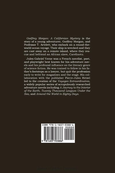 Godfrey Morgan: A Californian Mystery is the story of a young adventurer, Godfrey Morgan, and Professor T. Artelett, who embark on a round-the-world ocean voyage. Their ship is wrecked and they are cast away on a remote island, where they rescue and befriend an African slave, Carefinotu. Jules Gabriel Verne was a French novelist, poet, and playwright best known for his adventure novels and his profound influence on the literary genre of science fiction. He was trained to follow in his father's footsteps as a lawyer, but quit the profession early to write for magazines and the stage. His…mehr