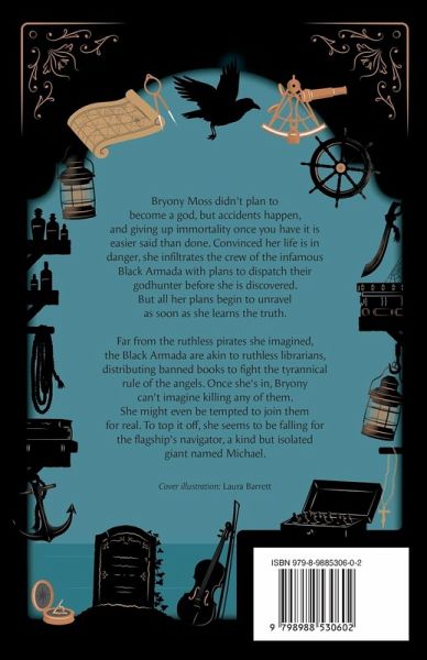 Bryony Moss didn't plan to become a god, but accidents happen, and giving up immortality once you have it is easier said than done. Convinced her life is in danger, she infiltrates the crew of the infamous Black Armada with plans to dispatch their godhunter before she is discovered. But all her plans begin to unravel as soon as she learns the truth. Far from the ruthless pirates she imagined, the Black Armada are akin to ruthless librarians, distributing banned books to fight the tyrannical rule of the angels. Once she's in, Bryony can't imagine killing any of them. She might even be tempted to join them for real. To top it off, she seems to be falling for the flagship's navigator, a kind but isolated giant named Michael.