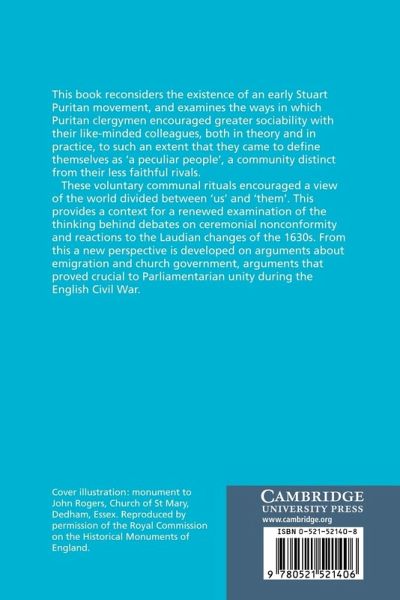 This book reconsiders the existence of an early Stuart Puritan movement, and examines the ways in which Puritan clergymen encouraged greater sociability with their like-minded colleagues, both in theory and in practice, to such an extent that they came to define themselves as 'a peculiar people', a community distinct from their less faithful rivals. Their voluntary communal rituals encouraged a view of the world divided between 'us' and 'them'. This provides a context for a renewed examination of the thinking behind debates on ceremonial nonconformity and reactions to the Laudian changes of the 1630s. From this a new perspective is developed on arguments about emigration and church government, arguments that proved crucial to Parliamentarian unity during the English Civil War.