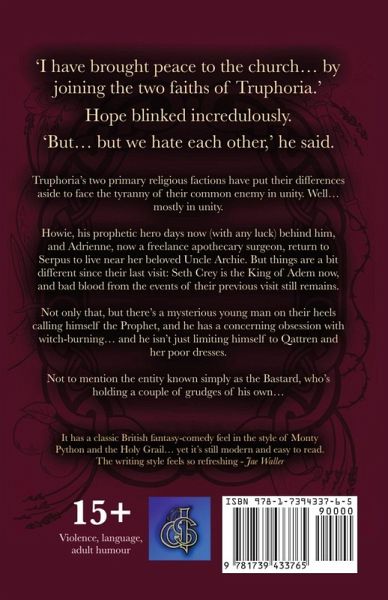 'I have brought peace to the church... by joining the two faiths of Truphoria.' Hope blinked incredulously. 'But... but we hate each other,' he said. Truphoria's two primary religious factions have put their differences aside to face the tyranny of their common enemy in unity. Well... mostly in unity. Howie, his prophetic hero days now (with any luck) behind him, and Adrienne, now a freelance apothecary surgeon, return to Serpus to live near her beloved Uncle Archie. But things are a bit different than their last visit: Seth Crey is the King of Adem now, and bad blood from the events of their previous visit still remains. Not only that, but there's a mysterious young man on their heels calling himself the Prophet, and he has a concerning obsession with witch-burning... and he isn't just limiting himself to Qattren and her poor dresses. Not to mention the entity known simply as the Bastard, who's holding a couple of grudges of his own...