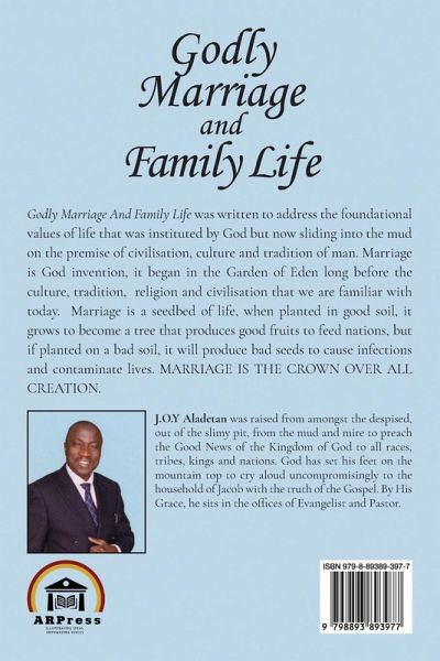 Godly Marriage And Family Life was written to address the foundational values of life that was instituted by God but now sliding into the mud on the premise of civilisation, culture and tradition of man. Marriage is God invention, it began in the Garden of Eden long before the culture, tradition, religion and civilisation that we are familiar with today. Marriage is a seedbed of life, when planted in good soil, it grows to become a tree that produces good fruits to feed nations, but if planted on a bad soil, it will produce bad seeds to cause infections and contaminate lives. MARRIAGE IS THE CROWN OVER ALL CREATION.