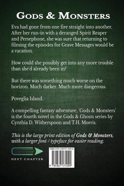 Eva had gone from one fire straight into another. After her run-in with a deranged Spirit Reaper and Persephone, she was sure that returning to filming the episodes for Grave Messages would be a vacation. How could she possibly get into any more trouble than she'd already been in? But there was something much worse on the horizon. Much darker. Much more dangerous. Poveglia Island. A compelling fantasy adventure, 'Gods & Monsters' is the fourth novel in the Gods & Ghosts series by Cynthia D. Witherspoon and TH Morris. This is the large print edition of Gods & Monsters, with a larger font / typeface for easier reading.¿