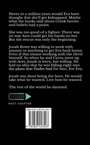 Never in a million years would Eva have thought that she'll get kidnapped. Maybe what the books said about Greek heroes and hubris had a point. She was too good of a fighter. There was no way Ares could get his hands on her. But the rescue was only the beginning. Jonah Rowe was willing to work with anyone or anything to get Eva back home. Even if that meant working with the Devil himself. So when he and Cyrus meet up with Ares, Jonah is leery, but willing. He had no idea that he was falling right into the plans that Hades had for him. For Eva. Jonah was done being the hero. He would take what he wanted. Live how he wanted. The rest of the world be damned.