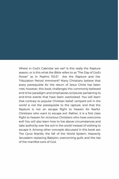 Where in God's Calendar are we? Is this really the Rapture season, or is this what the Bible refers to as "The Day of God's Power" as in Psalms 110:3? Are the Rapture and the Tribulation Period imminent? Many Christians believe that every prerequisite for the return of Jesus Christ has been met; however, this book challenges this commonly-believed end-time paradigm and emphasizes scriptures pertaining to end-time events that have been overlooked. You will learn that contrary to popular Christian belief, rampant evil in the world is not the prerequisite to the rapture and that the Rapture is not an escape flight to heaven for fearful Christians who want to escape evil. Rather, it is a first-class flight to heaven for victorious Christians who have overcome evil! You will also learn how to live above circumstances and take authority over the evil in the world instead of wishing to escape it. Among other concepts discussed in this book are: The Cyrus Mantle; the fall of the World System; Heavenly Jerusalem replacing Babylon; overcoming guilt; and the rise of the manifest sons of God