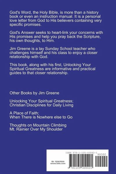 This is the original cover, also available as God's Answer for Women and God's Answer for Men. The same book with different covers. God's Answer seeks to heart-link your concerns with His promises and help you pray back the Scriptures to Him. Jim Greene is a lay Sunday School teacher who challenges himself and his class to enjoy a closer relationship with God. This book, along with Jim's first, Unlocking Your Spiritual Greatness are informative and practical guides to that closer relationship. Also available from WestBow Press, A Division of Thomas Nelson, Amazon.com, Barnes and Noble