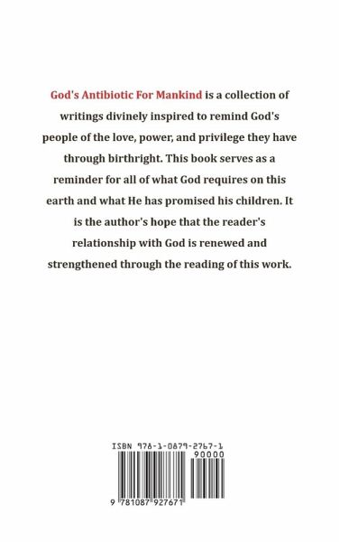 God's Antibiotic For Mankind is a collection of writings divinely inspired to remind God's people of the love, power, and privilege they have through birthright. This book serves as a reminder for all of what God requires on this earth and what He has promised his children. It is the author's hope that the reader's relationship with God is renewed and strengthened through the reading of this work.