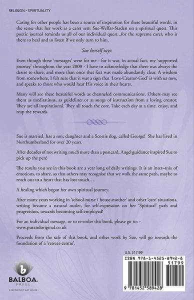 Caring for other people has been a source of inspiration for these beautiful words, in the sense that her work as a carer sent Sue-Welfar-Staden on a spiritual quest. This poetic journal reminds us all of our individual quest...for the supreme carer, who is there to heal and to listen if we only turn to him. Sue herself says: Even though these 'messages' were for me - for it was, in actual fact, my 'supported journey' throughout the year 2000 - I have to acknowledge that there was always the desire to share, and more than once that fact was made abundantly clear. A wisdom from somewhere, I felt sure that it was a sign that 'Love-Creator-God' is with us now, and speaks to those who would hear His voice in their hearts. Many will see these beautiful words as channeled communications. Others may see them as meditations, as guidelines or as songs of instruction from a loving creator. They are all inspirational. They all touch the core. Take each day at a time, enjoy, and reap the rewards.