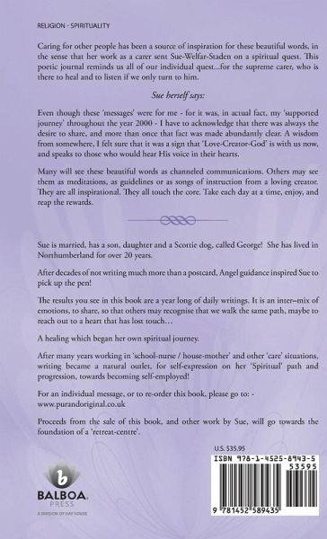 Caring for other people has been a source of inspiration for these beautiful words, in the sense that her work as a carer sent Sue-Welfar-Staden on a spiritual quest. This poetic journal reminds us all of our individual quest...for the supreme carer, who is there to heal and to listen if we only turn to him. Sue herself says: Even though these 'messages' were for me - for it was, in actual fact, my 'supported journey' throughout the year 2000 - I have to acknowledge that there was always the desire to share, and more than once that fact was made abundantly clear. A wisdom from somewhere, I felt sure that it was a sign that 'Love-Creator-God' is with us now, and speaks to those who would hear His voice in their hearts. Many will see these beautiful words as channeled communications. Others may see them as meditations, as guidelines or as songs of instruction from a loving creator. They are all inspirational. They all touch the core. Take each day at a time, enjoy, and reap the rewards.