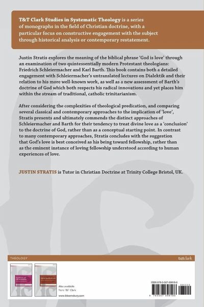 Justin Stratis explores the meaning of the biblical phrase 'God is love' through an examination of two quintessentially modern Protestant theologians: Friedrich Schleiermacher and Karl Barth. This book contains both a detailed engagement with Schleiermacher's untranslated lectures on Dialektik and their relation to his more well-known work, as well as a new assessment of Barth's doctrine of God which both respects his radical innovations and yet places him within the stream of traditional, catholic trinitarianism. After considering the complexities of theological predication, and comparing several classical and contemporary approaches to the implication of 'love', Stratis presents and ultimately commends the distinct approaches of Schleiermacher and Barth for their tendency to treat divine love as a 'conclusion' to the doctrine of God, rather than as a conceptual starting point. In contrast to many contemporary approaches, Stratis concludes with the suggestion that God's love is best conceived as his being toward fellowship, rather than as the eminent instance of loving fellowship understood according to human experiences of love.