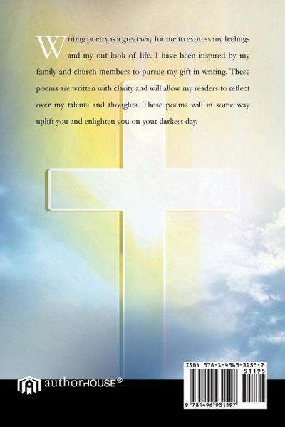 Writing poetry is a great way for me to express my feelings and my out look of life. I have been inspired by my family and church members to pursue my gift in writing. These poems are written with clarity and will allow my readers to reflect over my talents and thoughts. These poems will in some way uplift you and enlighten you on your darkest day.