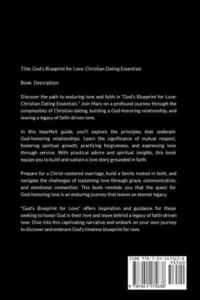 Title: God's Blueprint for Love: Christian Dating Essentials Book Description: Discover the path to enduring love and faith in "God's Blueprint for Love: Christian Dating Essentials." Join Mary on a profound journey through the complexities of Christian dating, building a God-honoring relationship, and leaving a legacy of faith-driven love. In this heartfelt guide, you'll explore the principles that underpin God-honoring relationships. Learn the significance of mutual respect, fostering spiritual growth, practicing forgiveness, and expressing love through service. With practical advice and spiritual insights, this book equips you to build and sustain a love story grounded in faith. Prepare for a Christ-centered marriage, build a family rooted in faith, and navigate the challenges of sustaining love through grace, communication, and emotional connection. This book reminds you that the quest for God-honoring love is an enduring journey that leaves an eternal legacy. "God's Blueprint for Love" offers inspiration and guidance for those seeking to honor God in their love and leave behind a legacy of faith-driven love. Dive into this captivating narrative and embark on your own journey to discover and embrace God's timeless blueprint for love.