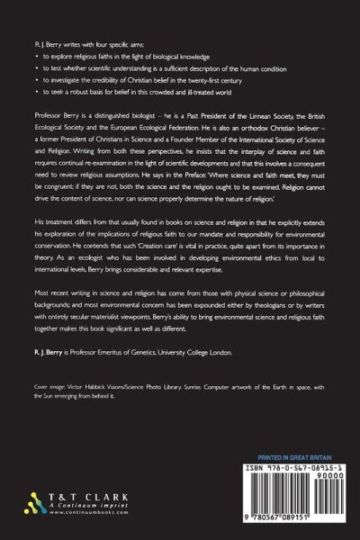 R. J. Berry writes as a professional biologist and as a Christian believer. He contends that the interplay of science and faith requires continual re-examination in the light of scientific developments, with the consequent need to review religious assumptions. To quote from his Preface: "Where science and faith meet, they must be congruent; if they are not, both the science and the religion ought to be examined. Religion cannot drive the content of science, nor can science properly determine the nature of religion."R. J. Berry's treatment differs from traditional work in science and religion in that he intentionally and explicitly extends his exploration of the implications of religious faith for contemporary science to environmental conservation, or 'Creation care'. Professor Berry's expertise in this area is considerable - as an ecologist who has long been involved in developing environmental ethics both locally and internationally. He argues that the contribution of religious belief to environmental science is highly important, not only in theoretical terms but also in practice.This book does not assume extensive, specialised background knowledge. It will be of immense interest to anyone concerned with environmental problems, scientists and religious believers exploring contemporary applications of religious faith.