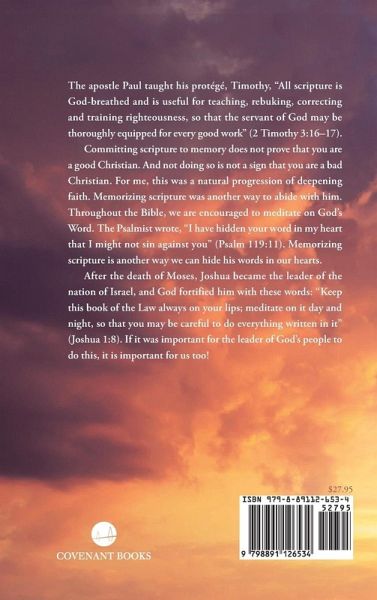 The apostle Paul taught his protege, Timothy, "All scripture is God-breathed and is useful for teaching, rebuking, correcting and training righteousness, so that the servant of God may be thoroughly equipped for every good work" (2 Timothy 3:16-17). Committing scripture to memory does not prove that you are a good Christian. And not doing so is not a sign that you are a bad Christian. For me, this was a natural progression of deepening faith. Memorizing scripture was another way to abide with him. Throughout the Bible, we are encouraged to meditate on God's Word. The Psalmist wrote, "I have hidden your word in my heart that I might not sin against you" (Psalm 119:11). Memorizing scripture is another way we can hide his words in our hearts. After the death of Moses, Joshua became the leader of the nation of Israel, and God fortified him with these words: "Keep this book of the Law always on your lips; meditate on it day and night, so that you may be careful to do everything written in it" (Joshua 1:8). If it was important for the leader of God's people to do this, it is important for us too!