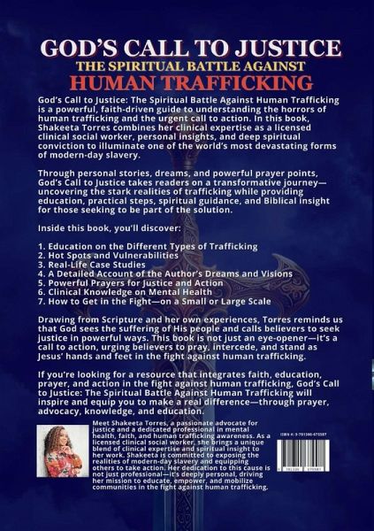 God's Call to Justice: The Spiritual Battle Against Human Trafficking is a powerful, faith-driven guide to understanding the horrors of human trafficking and the urgent call to action. In this book, Shakeeta Torres combines her clinical expertise as a licensed clinical social worker, personal insights, and deep spiritual conviction to illuminate one of the world's most devastating forms of modern-day slavery. Through personal stories, dreams, and powerful prayer points, God's Call to Justice takes readers on a transformative journey-uncovering the stark realities of trafficking while providing education, practical steps, spiritual guidance, and Biblical insight for those seeking to be part of the solution. Inside this book, you'll discover: 1.Education on the Different Types of Trafficking 2.Hot Spots and Vulnerabilities 3.Real-Life Case Studies 4. A Detailed Account of the Author's Dreams and Visions 5. Powerful Prayers for Justice and Action 6. Clinical Knowledge on Mental Health 7. How to Get in the Fight-on a Small or Large Scale Drawing from Scripture and her own experiences, Torres reminds us that God sees the suffering of His people and calls believers to seek justice in powerful ways. This book is not just an eye-opener-it's a call to action, urging believers to pray, intercede, and stand as Jesus' hands and feet in the fight against human trafficking. If you're looking for a resource that integrates faith, education, prayer, and action in the fight against human trafficking, God's Call to Justice: The Spiritual Battle Against Human Trafficking will inspire and equip you to make a real difference-through prayer, advocacy, knowledge, and education.