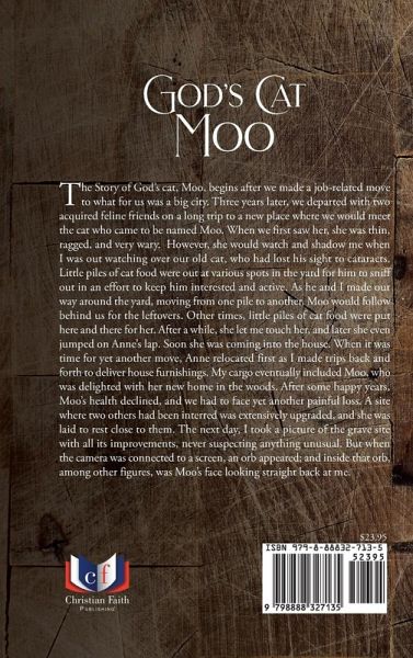 The Story of God's cat, Moo, begins after we made a job-related move to what for us was a big city. Three years later, we departed with two acquired feline friends on a long trip to a new place where we would meet the cat who came to be named Moo. When we first saw her, she was thin, ragged, and very wary. However, she would watch and shadow me when I was out watching over our old cat, who had lost his sight to cataracts. Little piles of cat food were out at various spots in the yard for him to sniff out in an effort to keep him interested and active. As he and I made our way around the yard, moving from one pile to another, Moo would follow behind us for the leftovers. Other times, little piles of cat food were put here and there for her. After a while, she let me touch her, and later she even jumped on Anne's lap. Soon she was coming into the house. When it was time for yet another move, Anne relocated first as I made trips back and forth to deliver house furnishings. My cargo eventually included Moo, who was delighted with her new home in the woods. After some happy years, Moo's health declined, and we had to face yet another painful loss. A site where two others had been interred was extensively upgraded, and she was laid to rest close to them. The next day, I took a picture of the grave site with all its improvements, never suspecting anything unusual. But when the camera was connected to a screen, an orb appeared; and inside that orb, among other figures, was Moo's face looking straight back at me.