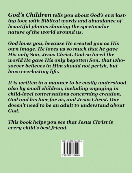 God's Children tells you about God's everlasting love with Biblical words and abundance of beautiful photos showing the spectacular nature of the world around us. God loves you, because He created you as His own image. He loves us so much that he gave His only Son, Jesus Christ. God so loved the world He gave His only begotten Son, that whosoever believes in Him should not perish, but have everlasting life. It is written in a manner to be easily understood also by small children, including engaging in child-level conversations concerning creation, God and his love for us, and Jesus Christ. One doesn't need to be an adult to understand about God. This book helps you to see that Jesus Christ is every child's best friend.