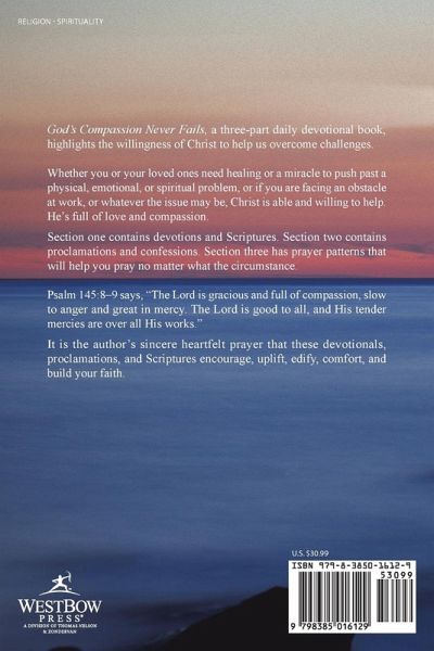 God's Compassion Never Fail, a three-part daily devotional book, highlights the willingness of Christ to help us overcome challenges. Whether you or your loved ones need healing or a miracle to push past a physical, emotional, or spiritual problem, or if you are facing an obstacle at work, or whatever the issue may be, Christ is able and willing to help. He's full of love and compassion. Section one contains devotions and Scriptures. Section two contains proclamations and confessions. Section three has prayer patterns that will help you pray no matter what the circumstance. Psalm 145:8-9 says, "The Lord is gracious and full of compassion, slow to anger and great in mercy. The Lord is good to all, and His tender mercies are over all His works." It is the author's sincere heartfelt prayer that these devotionals, proclamations, and Scriptures encourage, uplift, edify, comfort, and build your faith.