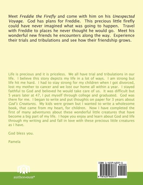 Meet Freddie the Firefly and come with him on his Unexpected Voyage. God has plans for Freddie.This precious little firefly could have never imagined what was going to happen. Travel with Freddie to places he never thought he would go. Meet his wonderful new friends he encounters along the way. Experience their trials and tribulations and see how their friendship grows.