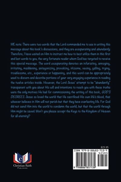 ME note: There were two words that the Lord commanded me to use in writing this message about this book's discussions, and they are exasperating and abundantly. Therefore, I have waited on Him to instruct me how to best utilize them in this first and last words to you, the very fortunate reader whom God has targeted to receive this special message. The word exasperating denotes an infuriating, annoying, irritating, maddening, antagonizing, provoking, irksome, vexing, galling, trying, troublesome, etc., experience or happening, and this word can be appropriately used to discern and describe portions of your very engaging experience in reading the twelve articles inside. However, the Lord Jesus' attempt to be "abundantly" transparent with you about His will and intentions to reach you with these truths were the only motives He had for commissioning the writing of this book, God's Decrees. Jesus so loved the world that He sacrificed His own life's blood, that whoever believes in Him will not perish but that they have everlasting life. For God did not send Him into the world to condemn the world, but that the world through Him might be saved. Won't you please accept the Keys to the Kingdom of Heaven for all eternity?