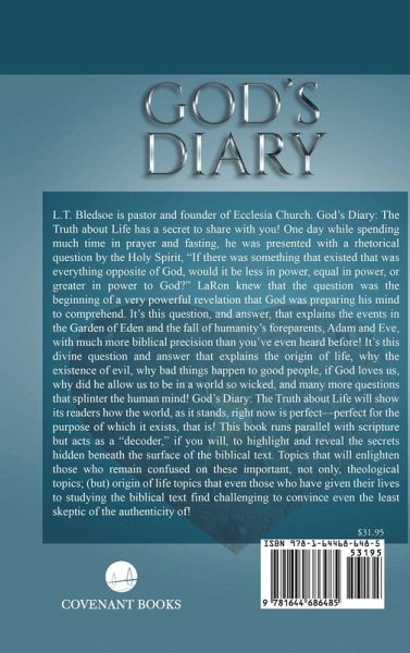L.T. Bledsoe is pastor and founder of Ecclesia Church. God's Diary: The Truth About Life has a secret to share with you! One day while spending much time in prayer and fasting, he was presented with a rhetorical question by the Holy Spirit, "If there was something that existed that was everything opposite of God, would it be less in power, equal in power, or greater in power to God?" L.T. knew that the question was the beginning of a very powerful revelation that God was preparing his mind to comprehend.It's this question, and answer, that explains the events in the Garden of Eden and the fall of humanity's foreparents, Adam and Eve, with much more biblical precision than you've even heard before! It's this divine question and answer that explains the origin of life, why the existence of evil, why bad things happen to good people, if God loves us, why did he allow us to be in a world so wicked, and many more questions that splinter the human mind!God's Diary: The Truth About Life will show its readers how the world, as it stands, right now is perfect-perfect for the purpose of which it exists, that is! This book runs parallel with scripture but acts as a "decoder," if you will, to highlight and reveal the secrets hidden beneath the surface of the biblical text. Topics that will enlighten those who remain confused on these important, not only, theological topics; (but) origin of life topics that even those who have given their lives to studying the biblical text find challenging to convince even the least skeptic of the authenticity of!