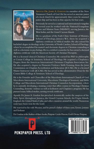 APOSTLE DR. JAMES A. GORDON is a member of the New Testament Church of God. He has served as associate pastor of a local church for approximately three years; he assumed pastor ship and has been in that capacity for four years. Previously he served as a national and international evangelist; for several years he worked with the National Evangelism Home and Mission Team (NEHMT), serving Jamaica, the West Indies, and the Grand Cayman Islands. He is a graduate of the Faith Clinic Institute of Ministry, School of Theology, Jamaica W.I.; there he acquired a diploma certificate in biblical studies. He also earned his bachelor's degree in theology at the University of North Carolina, School of Theology; where he accomplished his master's and doctorate degrees in Christian counseling as well as a doctorate in psychology. He is a certified counselor; he has earned a doctoral diploma certificate with the American Society of Christian Therapists. He is a licensed clinical Christian Counselor. He earned his PhD in philosophy at Conan College & Seminary School of Theology. He acquired a Chaplaincy Degree, from the American International Christians Chaplains Association Inc. He also acquired a degree in Domestic Violence Skills Training, from the Joint Commission on Chaplain Accreditation and Education (JCCAE). He is a licensed Master Instructor with (JCCAE). He has served as the administrative Dean for the Conon Bible College & Seminary School of Theology. He is the Founder and Chancellor of the Macedonia International Church of God, Macedonia International University, Macedonia Theological Seminary and Bible College and Macedonia International Christian Counselors Incorporation, where he is currently developing a training center that offers courses in Theology, Christian Counseling, domestic violence as well as facilitators and Chaplaincy programs. He has pursued many biblical studies, earning several certificates. Apostle Dr. James A. Gordon has preached dynamically under the auspices of the Holy Spirit throughout Jamaica, the Grand Cayman Islands, the Virgin Islands, England, the United States, Cuba, and other countries around the world. Numerous souls have been won for the Lord. He married to his wife Maxine, and he proud a father of three sons, Tyrone, Jerome and Teshaun. Dr. Gordon is the Author of three books, Purpose Under Process, God's Divine Purpose.