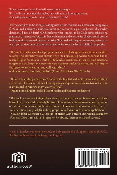 Those who hope in the Lord will renew their strength. They will soar on wings like eagles; they will run and not grow weary; they will walk and not be faint. (Isaiah 40v31, NIV) You were created to be an eagle soaring with divine revelation, an athlete running races for God, and a pilgrim walking this earth on your way to a glorious future. This weekly devotional based on Isaiah 40v31explores what it means to be God's eagle, athlete and pilgrim and interweaves with this theme the stories and testimonies of people with diverse backgrounds and from different countries. This book will inspire, encourage, exhort and teach you to view your circumstances and to live your life from a Biblical perspective. "This is a fine collection of real people's stories; their challenges, their successes and their failures, and ultimately their encounters with a gracious, powerful God who has an incredible plan for each one of us. Haide Sanchez intertwines the stories with scriptural insights and challenges in a masterful way. A serious weekly devotional that will inspire the reader to truly soar, run and walk with God." - Marcus Mosey, Lancaster, England (Pastor, Christians Alive Church) "This is a beautifully constructed book, with detailed and well-researched scriptural references. I believe it will be a blessing and an inspiration to the reader, and will be instrumental in bringing many closer to God." - Máire Byrne, Dublin, Ireland (proof-reader and blog site moderator) "This book is awesome, insightful and timely. It is one of the most interesting devotional books I have ever read especially because of the stories or testimonies of real people of our decade from a wide swathe of nations and Christian denominations. The one per week devotion is very helpful to busy people for reflection and personal application." - Gayle Haffner, Michigan, USA (author of Hands With a Heart: The Personal Biography of Actress ZaSu Pitts c.2011, Biography First Place, International Book Awards)