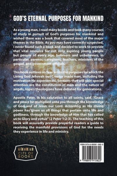 As a young man, I read many books and took many courses of study in pursuit of God's purposes for mankind and wished there was a book that covered most of the major themes in the Bible. As you may have correctly suspected, I never found such a book and decided to work to provide that vital resource for not only aspiring young people but people of every age, believers and unbelievers, in particular, parents, caregivers, teachers, ministers of the gospel, and government officials. This book outlines in clear terms the purposes for which the Living God Jehovah our Creator made man, including the motivation He experienced. Sections that will gain special attention are the constitution of man and the nature of angels, topics theologians have debated for generations. Apostle Peter, in his salutation to all saints, said, "Grace and peace be multiplied unto you through the knowledge of God and of Jesus our Lord. According as His divine power has given us all things that pertain unto life, and godliness, through the knowledge of Him that has called us to Glory and virtue" (2 Peter 1:2-3). The teaching of this book will assuredly provide prayerful readers a guide to receiving the manifold provisions of God for the needs they experience in life and ministry.