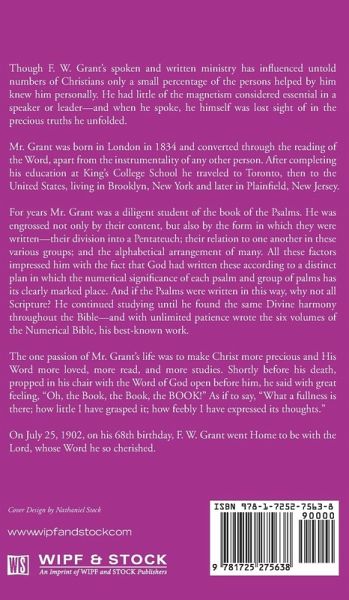 Though F. W. Grant's spoken and written ministry has influenced untold numbers of Christians only a small percentage of the persons helped by him knew him personally. He had little of the magnetism considered essential in a speaker or leader--and when he spoke, he himself was lost sight of in the precious truths he unfolded. Mr. Grant was born in London in 1834 and converted through the reading of the Word, apart from the instrumentality of any other person. After completing his education at King's College School he traveled to Toronto, then to the United States, living in Brooklyn, New York and later in Plainfield, New Jersey. For years Mr. Grant was a diligent student of the book of the Psalms. He was engrossed not only by their content, but also by the form in which they were written--their division into a Pentateuch; their relation to one another in these various groups; and the alphabetical arrangement of many. All these factors impressed him with the fact that God had written these according to a distinct plan in which the numerical significance of each psalm and group of palms has its clearly marked place. And if the Psalms were written in this way, why not all Scripture? He continued studying until he found the same Divine harmony throughout the Bible--and with unlimited patience wrote the six volumes of the Numerical Bible, his best-known work. The one passion of Mr. Grant's life was to make Christ more precious and His Word more loved, more read, and more studies. Shortly before his death, propped in his chair with the Word of God open before him, he said with great feeling, ""Oh, the Book, the Book, the BOOK!"" As if to say, ""What a fullness is there; how little I have grasped it; how feebly I have expressed its thoughts."" On July 25, 1902, on his 68th birthday, F. W. Grant went Home to be with the Lord, whose Word he so cherished.