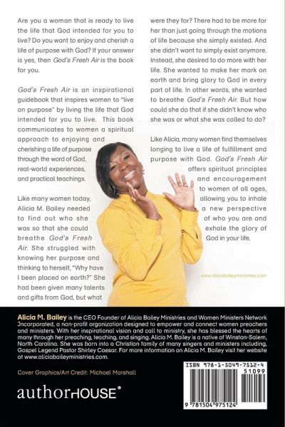 Are you a woman that is ready to live the life that God intended for you to live? Do you want to enjoy and cherish a life of purpose with God? If your answer is yes, then God's Fresh Air is the book for you. Like many women today, Alicia M. Bailey needed to find out who she was so that she could breathe God's Fresh Air. She struggled with knowing her purpose and thinking to herself, Why have I been placed on earth? She had been given many talents and gifts from God, but what were they for? There had to be more for her than just going to work and coming home because she just simply existed, going through the motions of life. And she didn't want to simply exist anymore. Instead, she desired to do more with her life. She wanted to make her mark on earth and bring glory to God in every part of life. In other words, she wanted to breathe God's fresh air. But how could she do that if she didn't know who she was or what she was called to do? God's Fresh Air communicates to all women a spiritual approach to enjoying and cherishing a life of purpose through the Word of God, real-world experiences, and practical teachings. God's Fresh Air is an inspirational guidebook that inspires women to live on purpose by living the life that God intended for you to live. Like Alicia, many women find themselves longing to live a life of fulfillment and purpose with God. God's Fresh Air offers spiritual principles and encouragement to women of all ages, allowing you to inhale a new perspective of who you are and exhale the glory of God in your life. Foreword by Shirley Caesar. www.aliciabaileyministries.com
