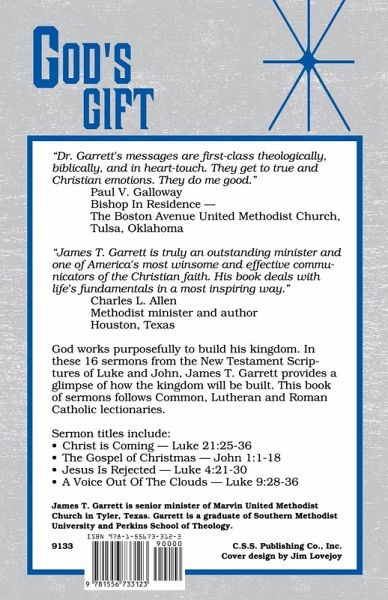 Dr. Garrett's messages are first-class theologically, biblically, and in heart-touch. They get to true and Christian emotions. They do me good. Paul V. Galloway Bishop in Residence -- The Boston Avenue United Methodist Church, Tulsa, Oklahoma James T. Garrett is truly an outstanding minister and one of America's most winsome and effective communicators of the Christian faith. His book deals with life's fundamentals in a most inspiring way. Charles L. Allen Methodist minister and author Houston, Texas God works purposefully to build his kingdom. In these sixteen sermons from the New Tesatment scriptures of Luke and John, James T. Garrett provides a glimpse of how the kingdom will be built. This book of sermons follows Common, Lutheran, and Roman Catholic lectionaries. Sermon titles include: • Christ Is Coming (Luke 21:25-36) • The Gospel of Christmas (John 1:1-18) • Jesus Is Rejected (Luke 4:21-30) • A Voice Out of the Clouds (Luke 9:28-36) James T. Garrett is senior minister of Marvin United Methodist Church in Tyler, Texas. Garrett is a graduate of Southern Methodist University and Perkins School of Theology.