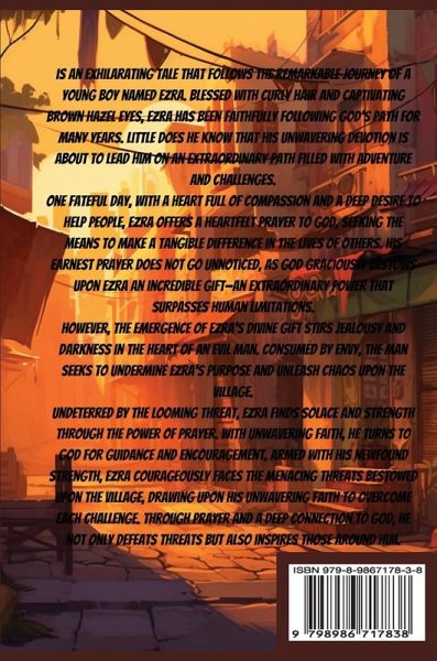 is an exhilarating tale that follows the remarkable journey of a young boy named Ezra. Blessed with curly hair and captivating brown hazel eyes, Ezra has been faithfully following God's path for many years. Little does he know that his unwavering devotion is about to lead him on an extraordinary path filled with adventure and challenges. One fateful day, with a heart full of compassion and a deep desire to help people, Ezra offers a heartfelt prayer to God, seeking the means to make a tangible difference in the lives of others. His earnest prayer does not go unnoticed, as God graciously bestows upon Ezra an incredible gift-an extraordinary power that surpasses human limitations. However, the emergence of Ezra's divine gift stirs jealousy and darkness in the heart of an evil man. Consumed by envy, the man seeks to undermine Ezra's purpose and unleash chaos upon the village. Undeterred by the löoming threat, Ezra finds solace and strength through the power of prayer. With unwavering faith, he turns to God for guidance and encouragement. Armed with his newfound strength, Ezra courageously faces the menacing threats bestowed upon the village, drawing upon his unwavering faith to overcome each challenge. Through prayer and a deep connection to God, he not only defeats threats but also inspires those around him.