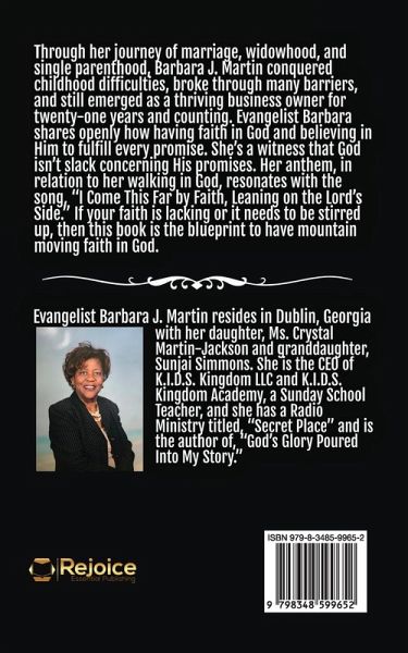 Through her journey of marriage, widowhood, and single parenthood, Barbara J. Martin conquered childhood difficulties, broke through many barriers, and still emerged as a thriving business owner for twenty-one years and counting. Evangelist Barbara shares openly how having faith in God and believing him to fulfill every promise. She's a witness that God isn't slack concerning his His promises. Her anthem, in relation to her walking in God, resonates with the song, "I Come This Far by Faith, Leaning on the Lord's Side." If your faith is lacking or it needs to be stirred up, then this book is the blueprint to have mountain moving faith in God.