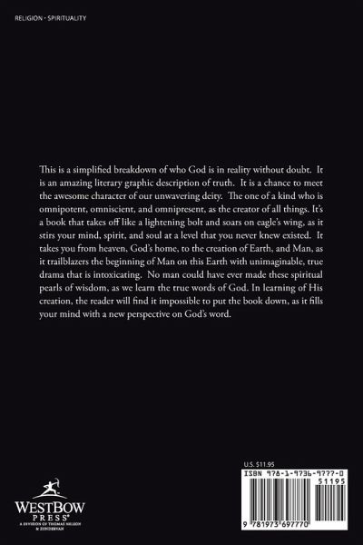 This is a simplified breakdown of who God is in reality without doubt. It is an amazing literary graphic description of truth. It is a chance to meet the awesome character of our unwavering deity. The one of a kind who is omnipotent, omniscient, and omnipresent, as the creator of all things. It's a book that takes off like a lightening bolt and soars on eagle's wing, as it stirs your mind, spirit, and soul at a level that you never knew existed. It takes you from heaven, God's home, to the creation of Earth, and Man, as it trailblazers the beginning of Man on this Earth with unimaginable, true drama that is intoxicating. No man could have ever made these spiritual pearls of wisdom, as we learn the true words of God. In learning of His creation, the reader will find it impossible to put the book down, as it fills your mind with a new perspective on God's word.