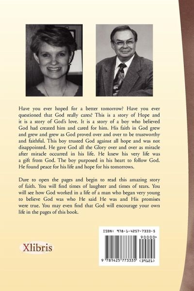 Have you ever hoped for a better tomorrow? Have you ever questioned that God really cares? This is a story of Hope and it is a story of God's love. It is a story of a boy who believed God had created him and cared for him. His faith in God grew and grew and grew as God proved over and over to be trustworthy and faithful. This boy trusted God against all hope and was not disappointed. He gave God all the Glory over and over as miracle after miracle occurred in his life. He knew his very life was a gift from God. The boy purposed in his heart to follow God. He found peace for his life and hope for his tomorrows. Dare to open the pages and begin to read this amazing story of faith. You will find times of laughter and times of tears. You will see how God worked in a life of a man who began very young to believe God was who He said He was and His promises were true. You may even find that God will encourage your own life in the pages of this book.