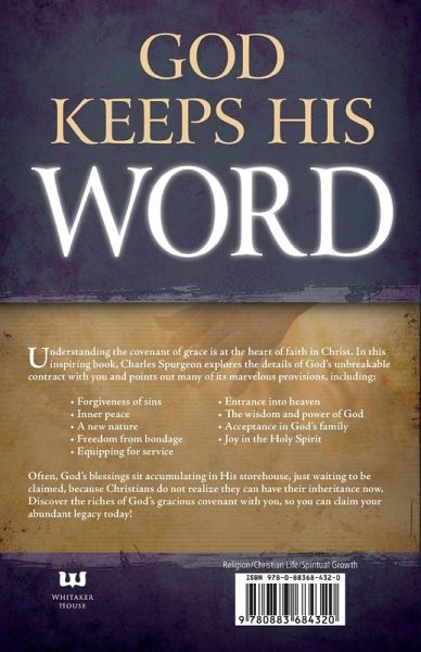 Understanding the covenant of grace is at the heart of faith in Christ. In this inspiring book, Charles Spurgeon explores the details of God's unbreakable contract with you and points out many of its marvelous provisions, including: * Forgiveness of your sins * Inner peace * A new nature * Freedom from bondage * Equipping for service * Entrance into heaven * The wisdom and power of God * Acceptance in God's family * Joy in the Holy Spirit Often, God's blessings sit accumulating in His storehouse, just waiting to be claimed, because Christians do not realize they can have their inheritance now. Discover the riches of God's gracious covenant with you, so you can claim your abundant legacy today!