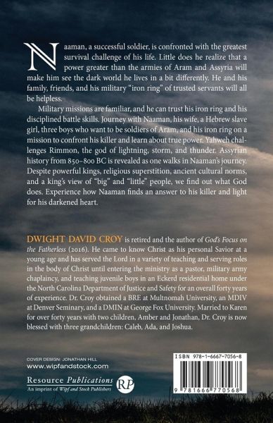 Naaman, a successful soldier, is confronted with the greatest survival challenge of his life. Little does he realize that a power greater than the armies of Aram and Assyria will make him see the dark world he lives in a bit differently. He and his family, friends, and his military ""iron ring"" of trusted servants will all be helpless. Military missions are familiar, and he can trust his iron ring and his disciplined battle skills. Journey with Naaman, his wife, a Hebrew slave girl, three boys who want to be soldiers of Aram, and his iron ring on a mission to confront his killer and learn about true power. Rimmon, the god of lightning, storm, and thunder, is challenged by Yahweh. Assyrian history from 850-800 BC is revealed as one walks in Naaman's journey. Despite powerful kings, religious superstition, ancient cultural norms, and a king's view of ""big"" and ""little"" people, we find out what God does. Experience how Naaman finds an answer to his killer and light for his darkened heart.