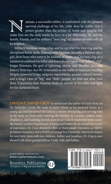Naaman, a successful soldier, is confronted with the greatest survival challenge of his life. Little does he realize that a power greater than the armies of Aram and Assyria will make him see the dark world he lives in a bit differently. He and his family, friends, and his military ""iron ring"" of trusted servants will all be helpless. Military missions are familiar, and he can trust his iron ring and his disciplined battle skills. Journey with Naaman, his wife, a Hebrew slave girl, three boys who want to be soldiers of Aram, and his iron ring on a mission to confront his killer and learn about true power. Rimmon, the god of lightning, storm, and thunder, is challenged by Yahweh. Assyrian history from 850-800 BC is revealed as one walks in Naaman's journey. Despite powerful kings, religious superstition, ancient cultural norms, and a king's view of ""big"" and ""little"" people, we find out what God does. Experience how Naaman finds an answer to his killer and light for his darkened heart.