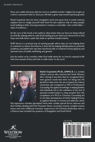 Once you realize that Jesus did not come to establish another religion but to give us a direct connection back to God, you will take a great step toward spiritual growth. David Copeland, who has done evangelism work and spent time in youth ministry, explains how to realign yourself with God. He also explores why so many people avoid walking in faith, choosing instead to continue a miserable-but comfortable-state of existence. At the core of the book is the author's observation that our lives are being refined by God. By utilizing what he calls God's healing process theory, he shares how to find hope and walk down a path that leads to spiritual transformation. GHP theory is a practical way of meeting people where they are and helping them to transition to where God desires. It does this by helping identify patterns, potential problems, and pitfalls that may have interfered with or hindered mental, physical, and spiritual areas of health, well-being, and growth. Join the author as he considers what God really wants for us, how to respond to life with love instead of fear, and how to walk closer to the Lord.