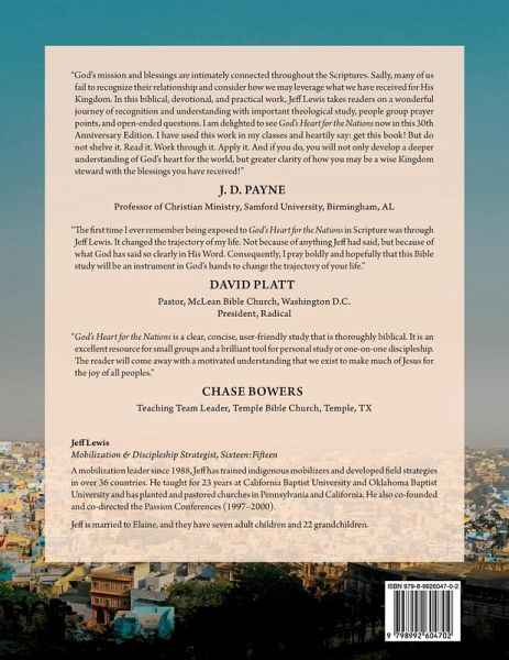 "God's mission and blessings are intimately connected throughout the Scriptures. Sadly, many of us fail to recognize their relationship and consider how we may leverage what we have received for His Kingdom. In this biblical, devotional, and practical work, Jeff Lewis takes readers on a wonderful journey of recognition and understanding with important theological study, people group prayer points, and open-ended questions. I am delighted to see God's Heart for the Nations now in this 30th Anniversary Edition. I have used this work in my classes and heartily say: get this book! But do not shelve it. Read it. Work through it. Apply it. And if you do, you will not only develop a deeper understanding of God's heart for the world, but greater clarity of how you may be a wise Kingdom steward with the blessings you have received!"