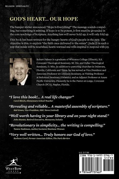 The bumper sticker announced: "Hope Is Everything!" The message sounds compelling, but something is missing. If hope is to be potent, it first must be grounded in the core teachings of Scripture. Anything less will never hold up; it will only fold up. This book has been written for the hungry hearts of God’s people in the pew. The objective is this: to explain "the faith once delivered to the saints" (Jude 3) in such a way that minds will be nourished, hearts warmed and wills inspired to respond with joy. "I love this book!… A real life changer" Carol Bleich, Elementary School Teacher "Revealing and reliable… A masterful assembly of scripture." Hal Green, Vice President, NBC News (retired) "Well worth having in your library and on your night stand." John Hunter, Retired Executive, Monsanto/Solutia "Revolutionary in simplicity… the writing is compelling." Tamra Nashman, Author/Lecturer/Business Woman "Very well written… Truly honors our God of love." Barbara Carol, Former Associate Editor, The Paris Review