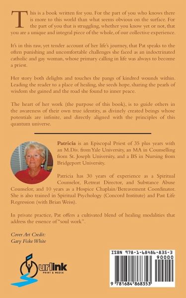 This is a book written for you. For the part of you who knows there is more to this world than what seems obvious on the surface. For the part of you that is struggling, whether you know yet or not, that you are a unique and integral piece of the whole, of our collective experience.It's in this raw, yet tender account of her life's journey, that Pat speaks to the often punishing and uncomfortable challenges she faced as an indoctrinated catholic and gay woman, whose primary calling in life was always to become a priest.Her story both delights and touches the pangs of kindred wounds within. Leading the reader to a place of healing, she seeds hope, sharing the pearls of wisdom she gained and the road she found to inner peace.The heart of her work (the purpose of this book), is to guide others in the awareness of their own true identity, as divinely created beings whose potentials are infinite, and directly aligned with the principles of this quantum universe.