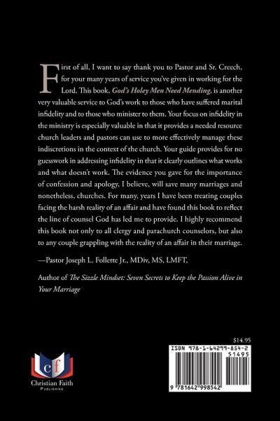 Is there hope for the restoration of your marriage after infidelity? Do you know "What went wrong?" How will you "Work through your problems?" Can you do anything to make it better? Should you confess your infidelity to your spouse or not? How do you "Affair Proof" your marriage? How do I determine if I or my spouse is vulnerable for an affair to occur? With so many couples, family members and congregations experiencing the devastating damage caused by broken relationships; can anything be done to fix what has been broken, stolen or lost? THE GOOD NEWS IS: YES! Discover what you can do to restore your marriage relationship! "Charles & LaVern Creech have provided in God's Holey Men Need Mending; And So Do You! a book, a service guide, a handbook to help or repair broken trust and ultimately to prevent marital infidelity. This is a one of the rare books in which every person will discover something of the unique dynamics of his/her life". Dr. Alfred R. Jones (Marriage & Family Life Professional)