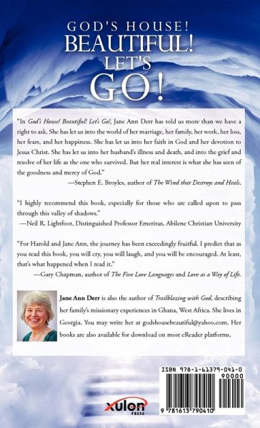 "In God's House! Beautiful! Let's Go!, Jane Ann Derr has told us more than we have a right to ask. She has let us into the world of her marriage, her family, her work, her loss, her fears, and her happiness. She has let us into her faith in God and her devotion to Jesus Christ. She has let us into her husband's illness and death, and into the grief and resolve of her life as the one who survived. But her real interest is what she has seen of the goodness and mercy of God." -Stephen E. Broyles, author of The Wind that Destroys and Heals. "I highly recommend this book, especially for those who are called upon to pass through this valley of shadows." -Neil R. Lightfoot, Distinguished Professor Emeritus, Abilene Christian University "For Harold and Jane Ann, the journey has been exceedingly fruitful. I predict that as you read this book, you will cry, you will laugh, and you will be encouraged. At least, that's what happened when I read it." -Gary Chapman, author of The Five Love Languages and Love as a Way of Life. Jane Ann Derr is also the author of Trailblazing with God, describing her family's missionary experiences in Ghana, West Africa. She lives in Georgia. You may write her at godshousebeautiful@yahoo.com. Her books are also available for download on most eReader platforms.