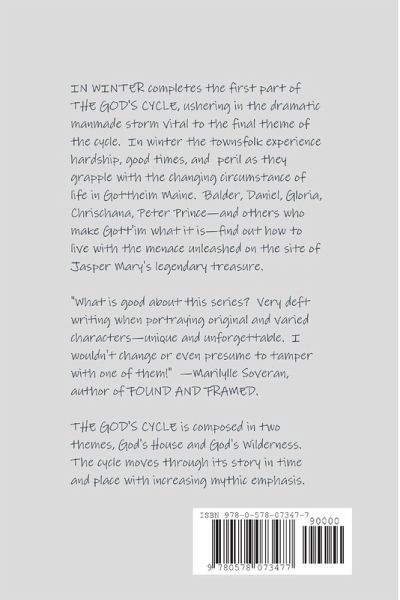 GOD'S HOUSE IN WINTER is the third book in The God's Cycle. Here begins increasing mythic qualities as Jasper Mountain comes alive, and nature redounds with fury to her glory. The wild creatures and inhabitants of Gott'im suffer.... And, too, they benefit from the recoil of human erring on a grand scale. When it so happens, in God's House, setting the stage for them to enter into God's Wilderness.