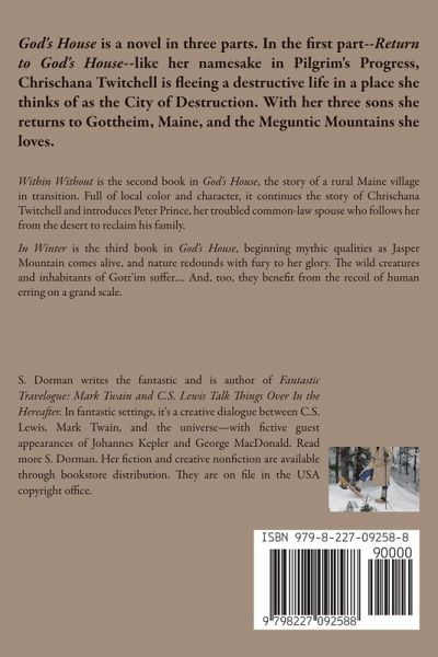 God's House is a novel in three parts. In the first part, -Return to God's House-like her namesake in Pilgrim's Progress, Chrischana Twitchell is fleeing a destructive life in a place she thinks of as the City of Destruction. With her three sons she returns to Gottheim, Maine, and an uncertain welcome in the Meguntic Mountains she loves. Called Gott'im by its inhabitants, this rural village and surrounding wilderness are changing with the influx of newcomers. Tensions between descendents of yankee settlers and those 'from away' have made it a place in transition where neighbors struggle to know one another in a real way. Return to God's House is the first book of God's House. -Within Without- is the second book in God's House, the story of a rural Maine village in transition. Full of local color and character, it continues the story of Chrischana Twitchell's return to Gott'im, and introduces Peter Prince, her troubled common-law spouse who follows her from the desert to reclaim his family. As a stranger in Gottheim he experiences bitter truths, and redeeming hopes, about himself and the nature of life in God's House. -In Winter- is the third book in God's House. Here begins increasing mythic qualities as Jasper Mountain comes alive, and nature redounds with fury to her glory. The wild creatures and inhabitants of Gott'im suffer.... And, too, they benefit from the recoil of human erring on a grand scale. When it so happens in God's House, setting the stage for them to enter into God's Wilderness. God's Wilderness-to be published-is the completion of The God's Cycle. The God's Cycle is five books, in two parts. GOD'S HOUSE and GOD'S WILDERNESS. Plus Gott'im's Monster 1808.