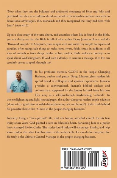 "Now when they saw the boldness and unfettered eloquence of Peter and John and perceived that they were unlearned and untrained in the schools (common men with no educational advantages), they marveled; and they recognized that they had been with Jesus," (Acts 4:13). Upon a close study of the verse above, and countless others like it found in the Bible, you can clearly see that the Bible is full of what author Doug Johnson likes to call the "Barnyard Gospel." In Scripture, Jesus taught with and used very simple examples and parables, often using such things as rocks, trees, rivers, fields, seeds, in addition to all sorts of animals -- from sheep, lambs, wolves, snakes, birds, and even donkeys - to speak about God's kingdom. If God used a donkey to send us a message, then He can certainly use us to speak through too! In his profound memoir, GOD'S in the People Changing Business, author and pastor Doug Johnson gives readers his special brand of colloquial and spiritual experiences. Johnson provides a conversational, layman's biblical analysis and commentary, supported by the lessons learned from his own life's story as a self-proclaimed, hardworking "redneck." In these enlightening and light-hearted pages, the author also gives readers ample evidence (along with a good dose of old-fashioned country wit and humor!) of the truth behind his powerful theme that "God is in the people-changing business." Formerly living a "non-spiritual" life, and not having attended church for his first thirty-seven years, God planted a seed in Johnson's heart, harvesting him as a pastor into a changed life for Christ. The stories found inside will encourage, inspire, and help show readers that what God has done in the author's life, He can do for everyone. For He truly is the ultimate General Manager in the people-changing business.