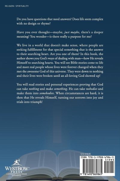 Do you have questions that need answers? Does life seem complex with no design or rhyme? Have you ever thought-maybe, just maybe, there's a deeper meaning? You wonder-is there really a purpose for me? We live in a world that doesn't make sense, where people are seeking fulfillment for that special something that is the answer to their searching heart. Are you one of them? In this book, the author shows you God's ways of dealing with man-how He reveals Himself to searching hearts. You will see Bible stories come to life and meet real people whose lives were forever changed when they met the awesome God of this universe. They were down to nothing and their lives were broken until an all-loving God showed up! You will read stories and personal experiences proving that God can take nothing and make something. He can take nobodies and make them into somebodies. When circumstances are hard, it is then that He reveals Himself, turning our sorrows into joy and trials into triumph!
